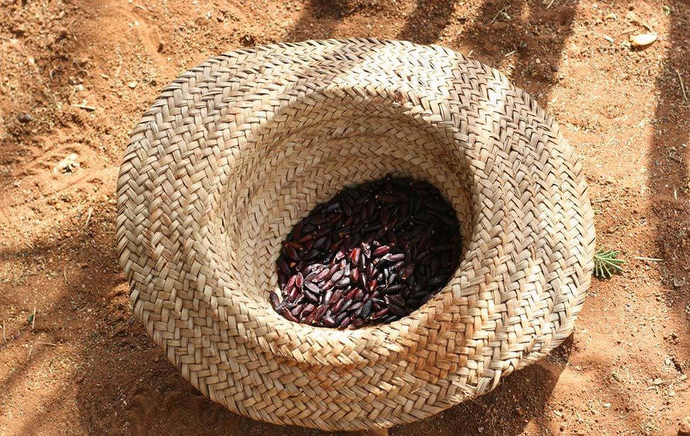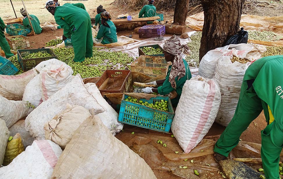 A mukau fruit contains two to four seeds that are encased in a hard nut. It is hard to extract seeds out of mukau fruits and it is done manually. First, we remove the outer cover of the fruit by hitting the fruit with a piece of wood while it is lying on a stone. The nuts inside the fruits are covered with pulp so we wash and sun-dry them for a couple of hours until they are clean and dry.