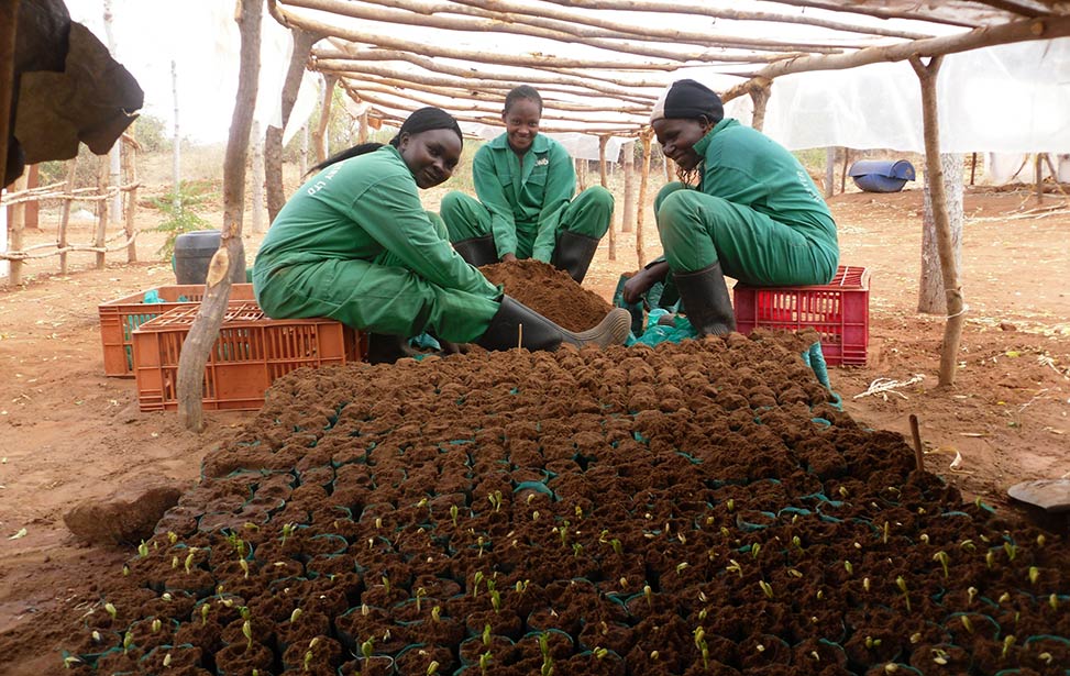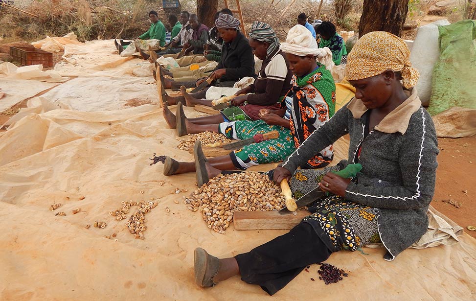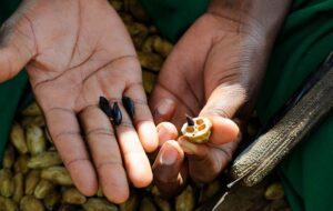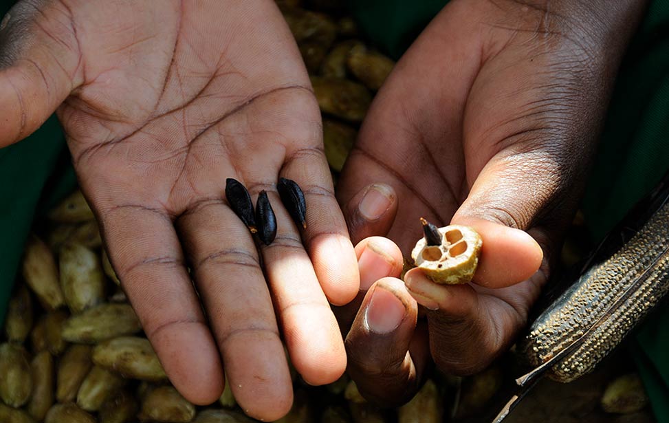 Cracking the nuts is a delicate process. Ordinary nut crackers cannot be used, since the nuts are too hard. Instead we use a knife or a panga (a bladed African tool like a machete) and hit the knife with a piece of wood to carefully crack the nut without damaging the seeds. The seeds are then pulled carefully from the cracked shell to prevent damaging its coat. If so, the seed is rejected. Once extracted, the seeds are nipped at the top, and soaked in water to allow germination.