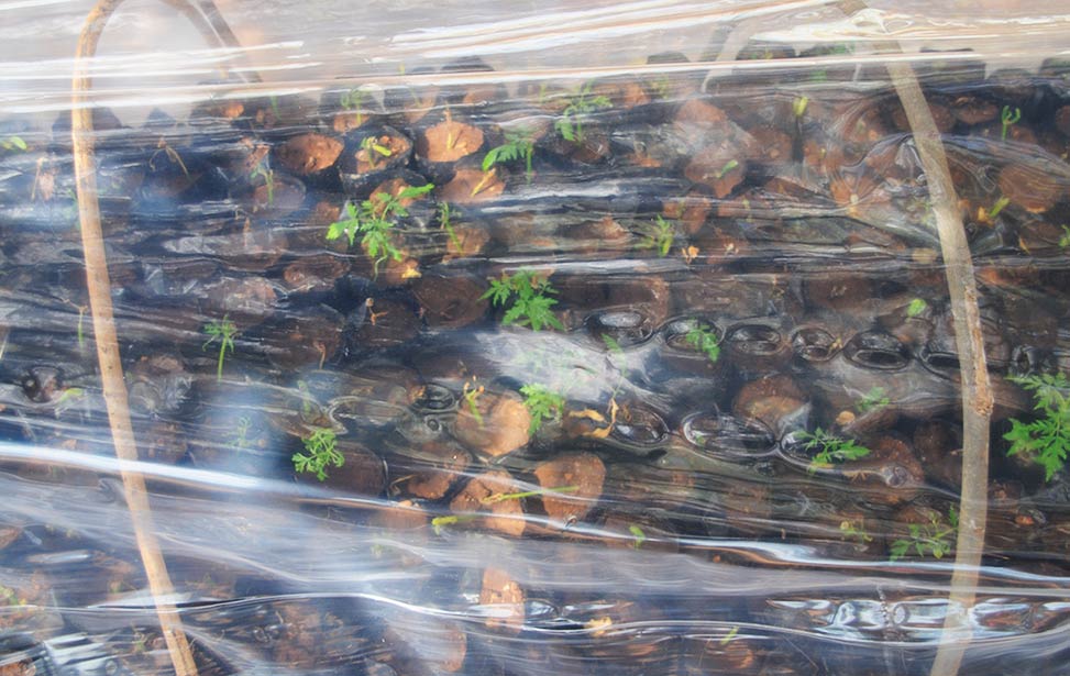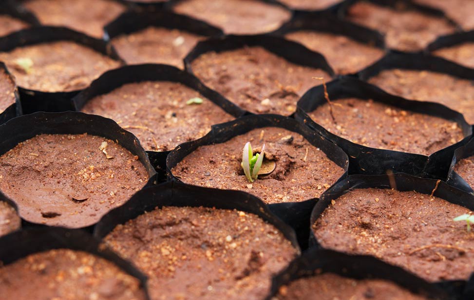Germination requires a hot and moist environment. This environment can be achieved by various means, a popular one being the use of so-called propagators. These are boxes made of plastic nailed to a wooden frame, which act as little greenhouses. After 7 to 10 days, with proper care, about 70 percent of the seeds will germinate. The little seedlings are then transplanted into pots/polybags for further growing. These freshly pricked-out seedlings need initial protection against cold and direct sun and are put into germination tunnels where they stay for about seven days.