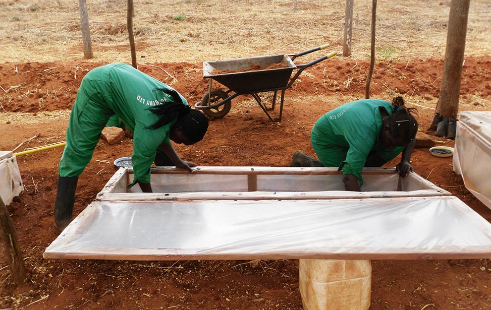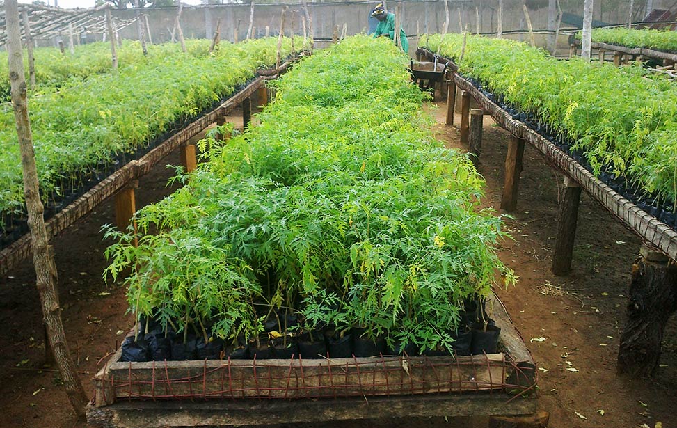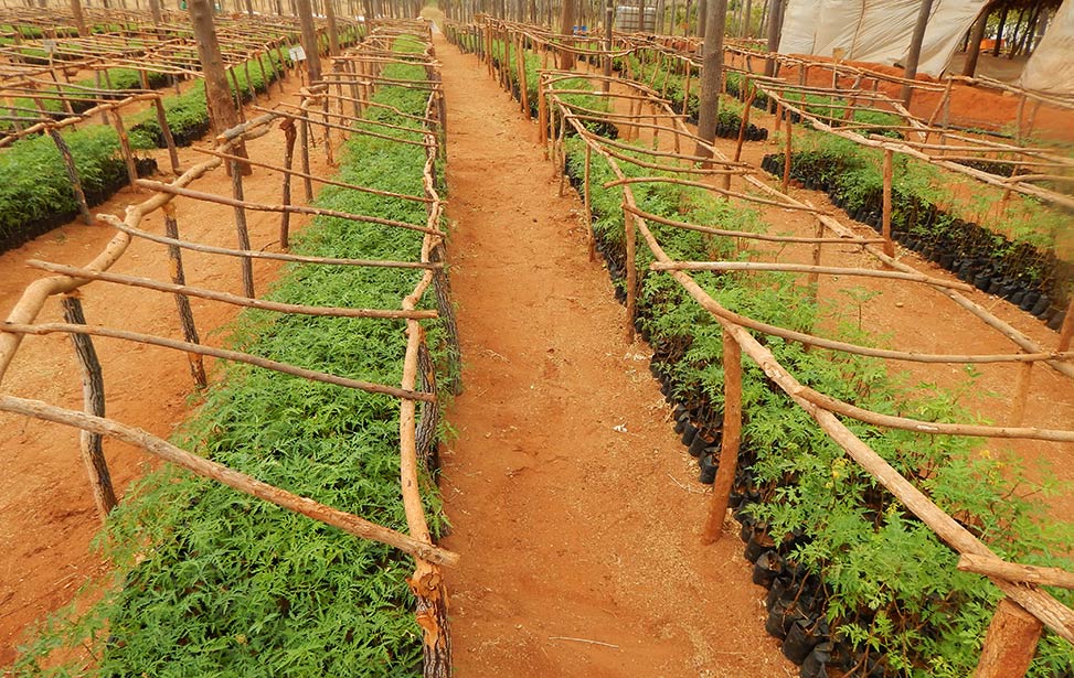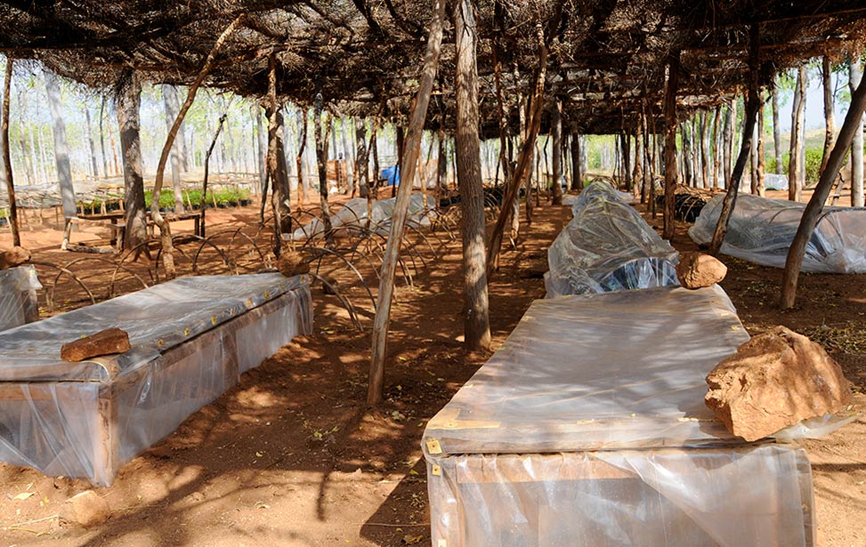 The soil is different from place to place. In Nyongoro, we need a stricter root development and have the mukau seedlings on raised beds to restrict root development (it is not good if the roots develop too fast) and to avoid getting in touch with the ground where fungus can propagate through sand. This way we also have better control over planting and time.
