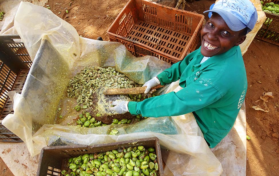 It is important that the seeds we use to plant new trees are of high quality. We therefore harvest fruits only from mukau “Plus” trees. Those trees have been marked for their superior quality and growing progress, which increases the likelihood of acquiring good seeds.
