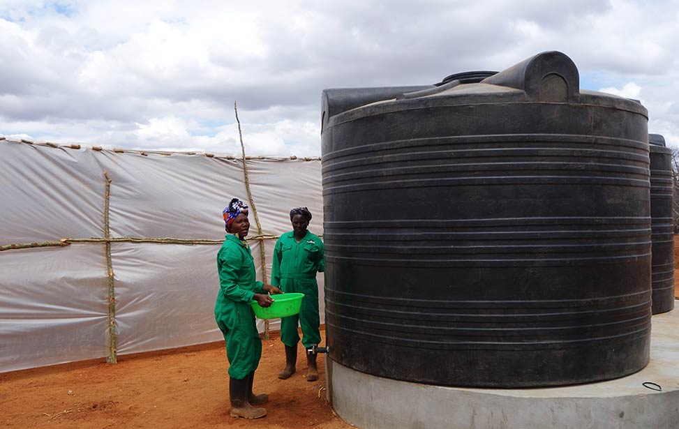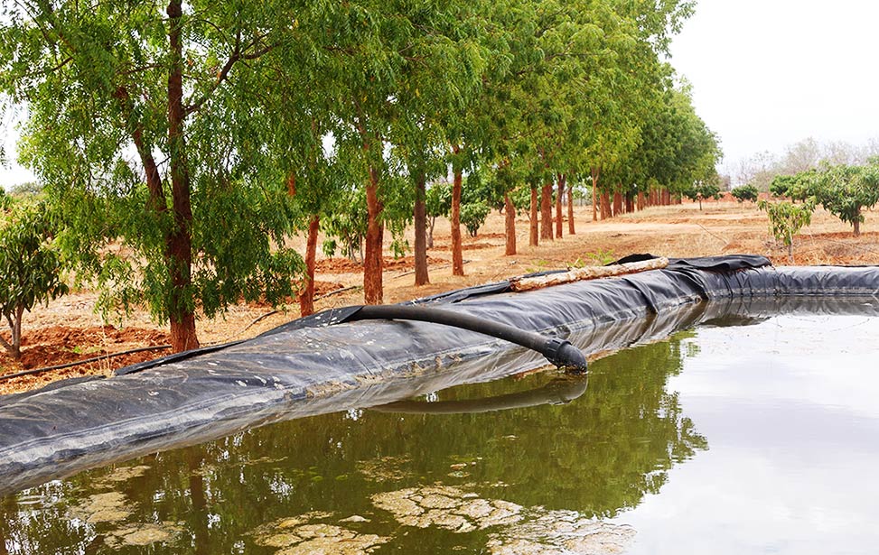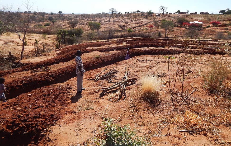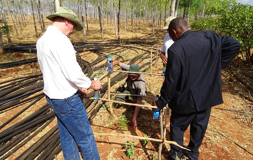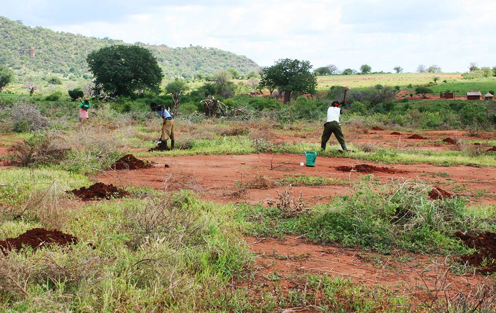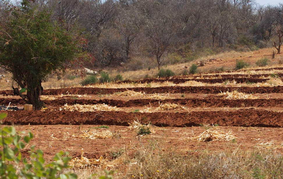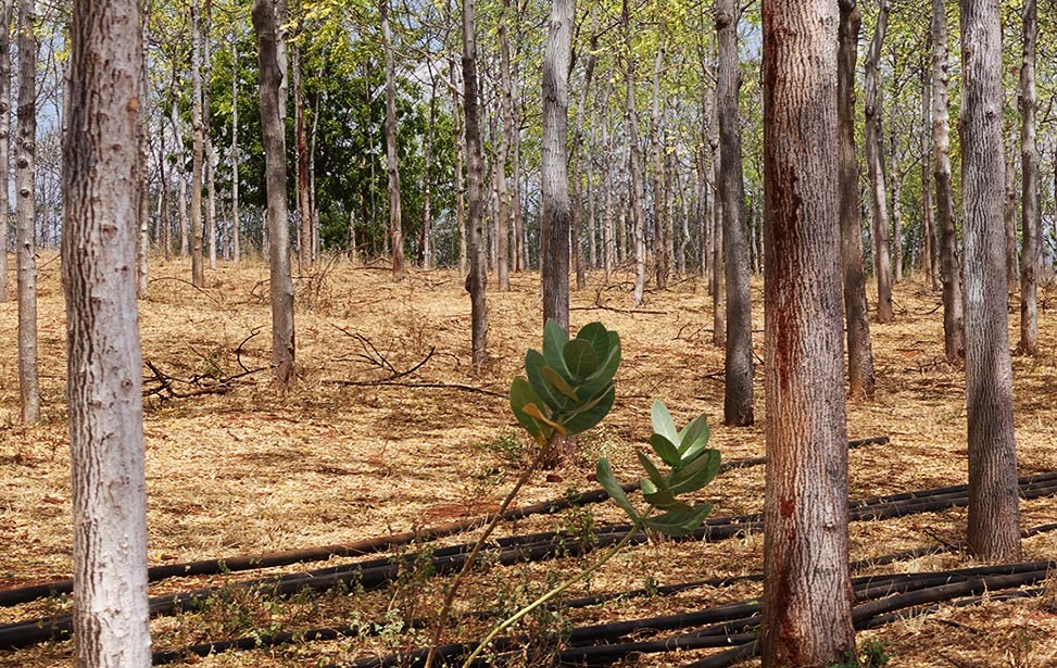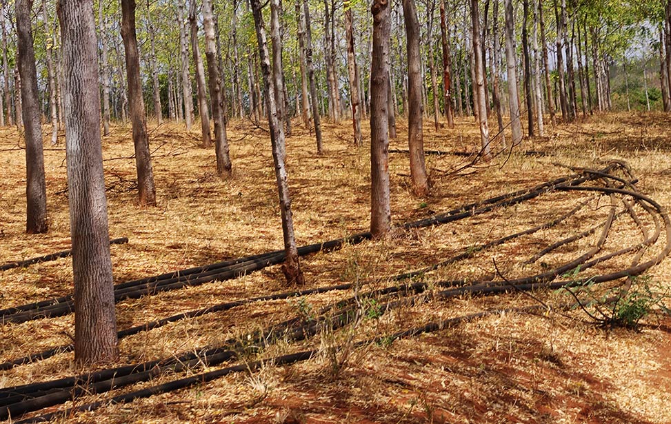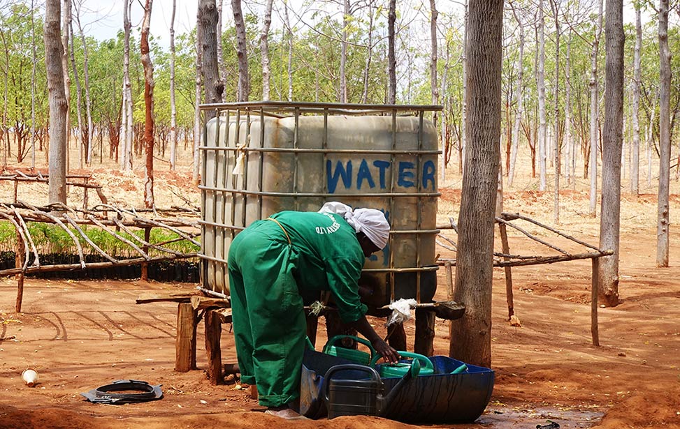 Economic and efficient watering can be done by drip-irrigation. Water basins are filled with water during rainy season and used as drip-irrigation throughout the dry season. In the field, we use our labor force to water each seedling individually. In Nyongoro, we use natural depressions that are deepened with the bulldozer to create water reservoirs, which are filled with water during the rainy season and act in the same capacity as the water basins.