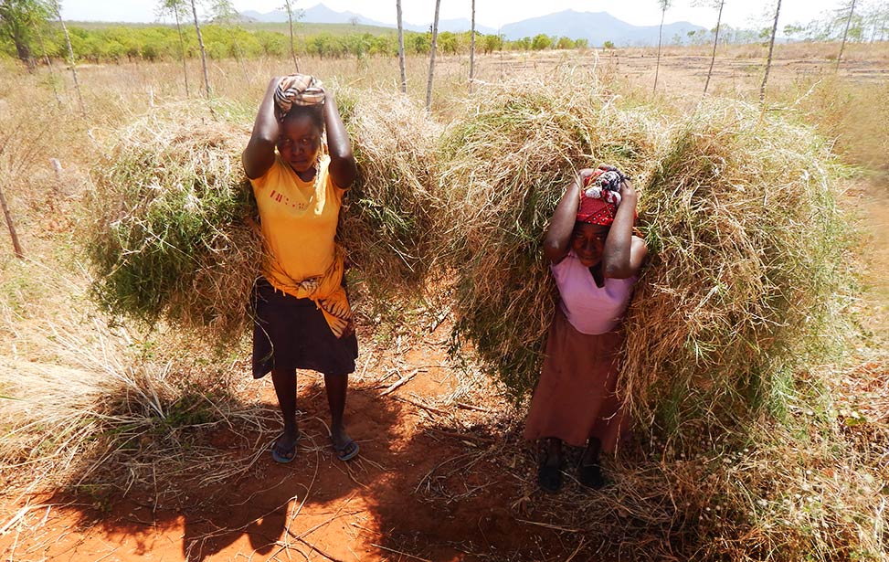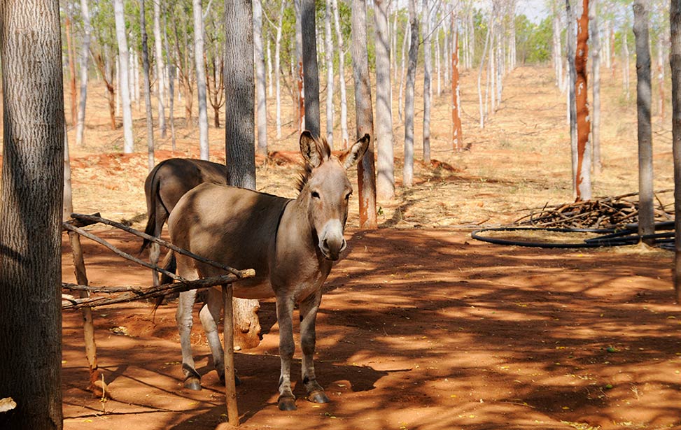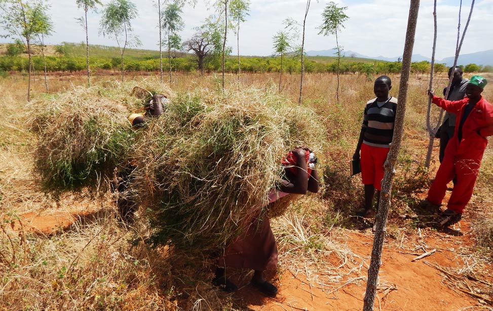 Because of drought, villagers have problems getting enough grass for their livestock, while we have enough grass and weeds we want to get rid of. This works perfectly for both the villagers and Better Globe Forestry. We organize locals so they can cut grass between our trees and we have had up to 200 people at the same time cutting grass for their livestock. This is also part of our CSR (Corporate Social Responsibility) to make good contact with our neighbors. We allow some schools that have cattle to grass around our older trees (as well as our own donkeys), which cannot be damaged by animals compare to our seedlings or young trees.