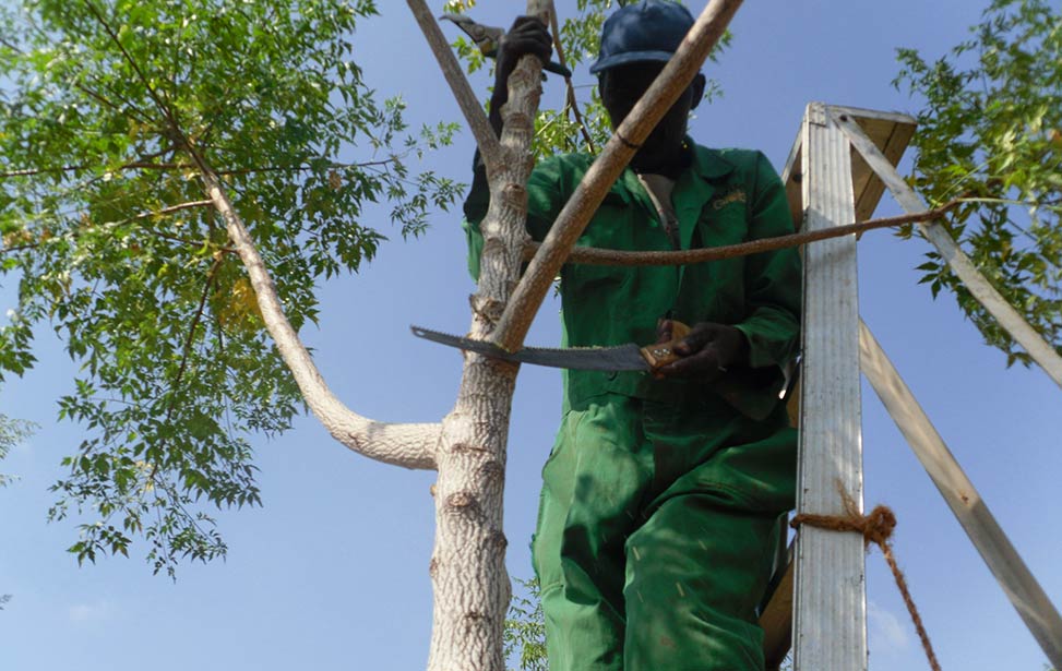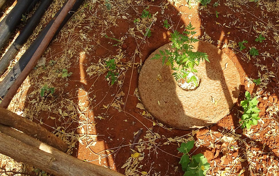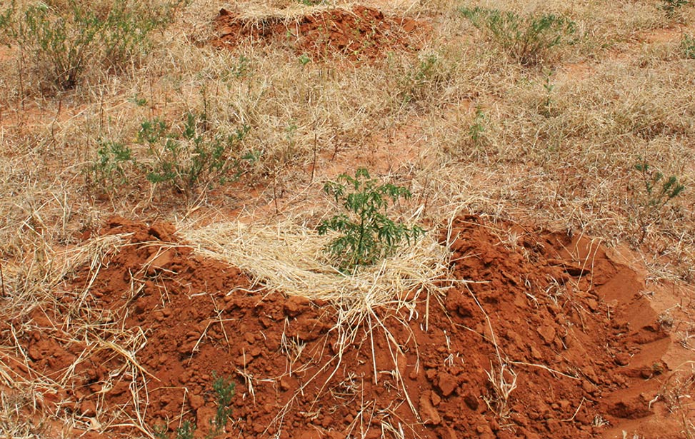 The seedlings must also be mulched to protect the underlying soil from drying and heating up. This way, the young root system will be protected. Generally, the mulching is done with dry grass or weeds which needs to be repeated every three months, because termites consume the mulch. The mulching diminishes the heat of the soil by about 2 Celsius degrees. The use of half-moons around the trees are to retain water. When the trees are young, we water them once a week.