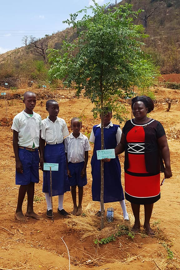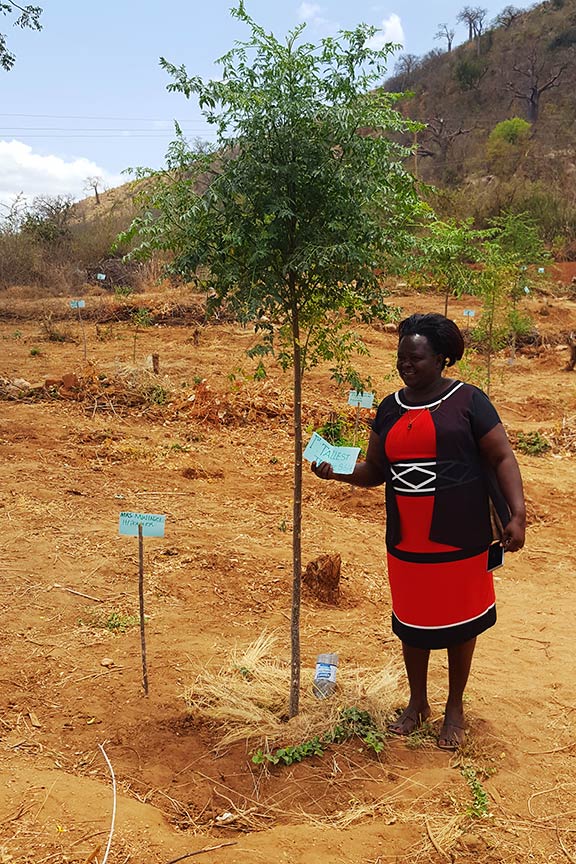 In the pictures below, we see Mrs. Ivuli, head teacher of Thua Primary School in Kitui County, and some students with their trees. This is part of our tree donation program for schools in cooperation with the Green Initiative Challenge. Each child is responsible for their own tree and has their name on it. Note the grass around the young tree and the half-moon shape on the ground that is made for the water to retain. These are simple but effective methods to increase the survival skills for the tree seedling during its first year.