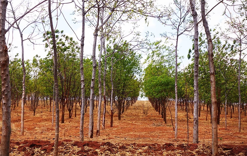This is the distance between the pits. Mukau needs full sunlight for its development. The minimum spacing should be 4 meters (13 ft), although complete agroforestry practices require a spacing of 7 to 10 meters (23-33 ft). Initial growth is fast and soon the branches of neighboring trees start competing with each other, and then the growth slows down. At a spacing of 4 meters, this competition sets in after 4 to 5 years and thinning is needed.